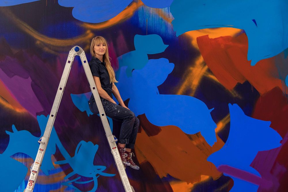 Nicole Mueller is a San Francisco-based visual artist. Her works include large-scale painting, murals, and installations which mimic the effect from stained glass. Motivated by processes the abstract pieces are vibrant and saturated. They are constructed with layers of collage-like shapes. Her art explores the variety of color, the state in flux, dichotomies inside painting, the fundamental transition of being, and the boundary between outside and inside, the intangible and tangible.